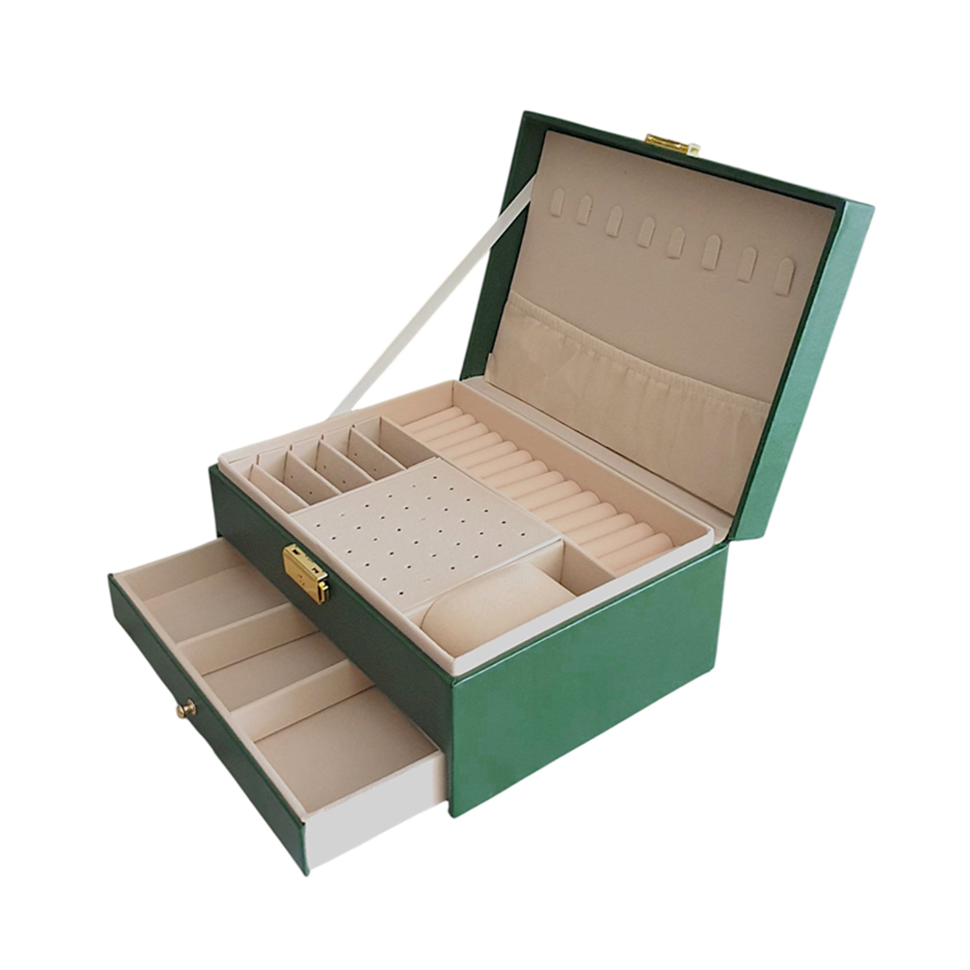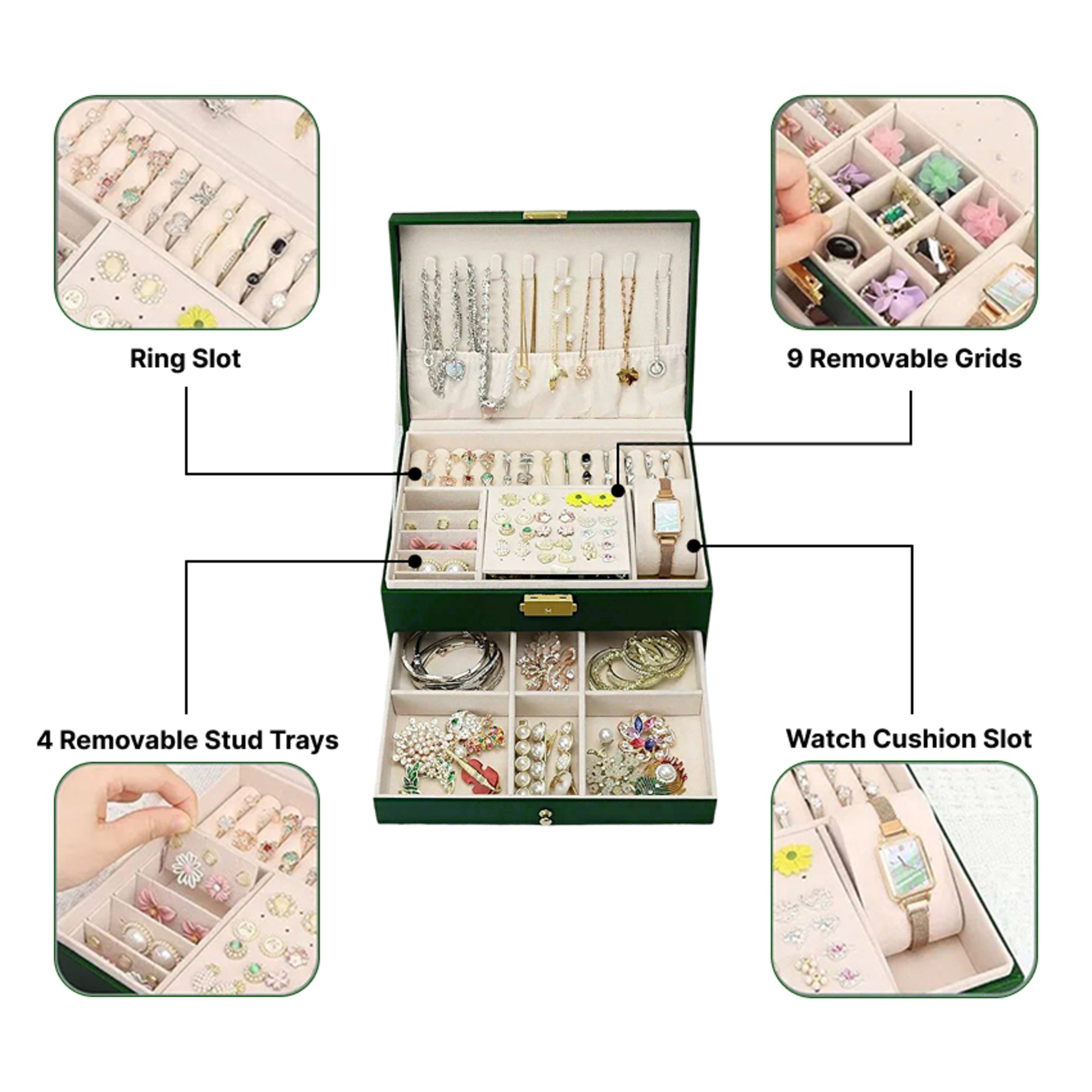 Inside, each section is thoughtfully designed — from ring slots to necklace hooks and spacious drawers — ensuring every piece finds its place safely and beautifully.