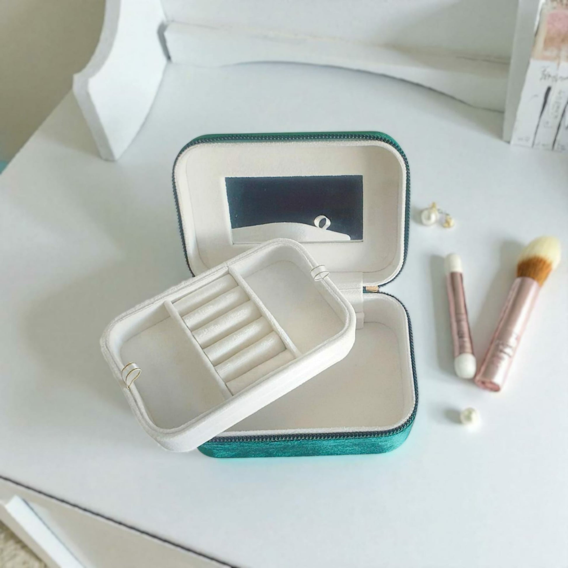 Open it and you’ll find a soft suede interior with a removable tray, ring slots, and roomy compartments — perfect for rings, studs, pendants, and tiny keepsakes. Compact enough to slip into a handbag or travel pouch, it keeps jewelry protected from scratches, dust, or getting lost during travel.
